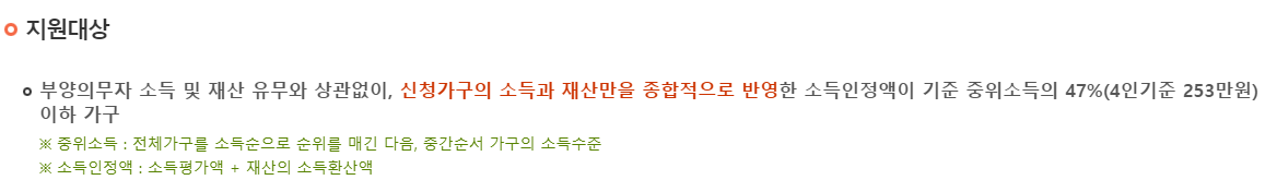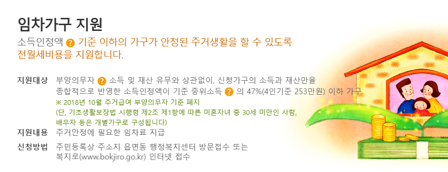 주거급여 신청자격으로는 자신의 월 소득과 재산의 환산한 소득인정액이 기준인데, 본인의 소득인정액이 전체 중위소득 47% 이하여야만 신청할 수 있습니다.