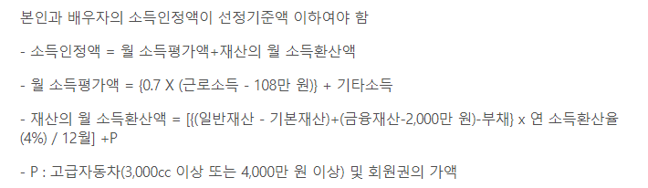 월소득 평가액은 0.7 × (근로소득 - 108만 원) + 기타 소득으로 계산되고 재산의 월 소득환산액은 (일반재산 - 기본재산) + (금융재산 - 2천만 원) 부 채× 4%입니다. 여기서 일반재산은 토지, 건물, 주택 등이고 기본 재산은 공제되는 금액으로 지역별로 차이가 있습니다. 계산하기가 어렵고 매우 복잡합니다.