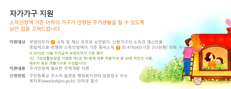 임차가구가 아닌 자가가구라면 도배, 장판등 수선유지비를 지원받습니다. 수선 유지비는 소득 인정액에 따라서 다르게 적용되며 생계급여 선정 기준 이하일 때는 100%의 수선비용이 지원됩니다. 주거급여 지원금액 자세한 지원내용은 홈페이지를 확인하시는게 정확합니다.