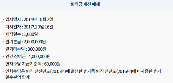 위와 같이 퇴직금 계산방법 공식은 단순히 월급 대비 얼마가 아닌 상여금부터 연차휴가수당, 평균 임금 수령액등을 적용해서 계산하기 때문에 복잡한 계산일 수 있어 어렵기도 합니다. 이럴 때에는 퇴직금 계산기를 이용하면 쉽게 퇴직금을 계산할 수 있습니다.