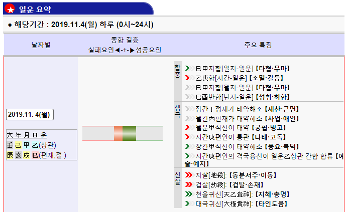 홈페이지 화면 왼쪽에 생일을 넣어 주시면 바로 사주풀이가 나옵니다. 사주 명식표도 나오는데요. 솔직히 일반사람들은 사주명식표를 봐도 잘 모르시는 분들이 더 많으실 것 같습니다.