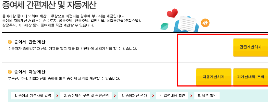 증여받은 재산의 가액을 알고 있다면 간편 계산하기를 선택하고 부동산 주식, 기타 재산의 증여에 따른 증여세 세액을 계산하고 싶다면 자동계산을 선택하여 계산하면 됩니다.