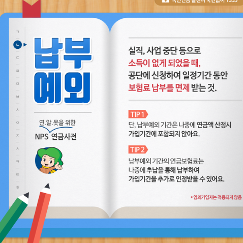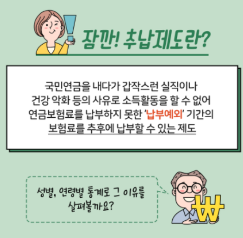 추납제도 대상은 납부 예외기간과 적용제외기간이 있는 사람이 신청할 수 있습니다. 납부예외기간은 국민연금 가입 후 소득이 없어서 국민연금을 내지 못한 기간입니다.