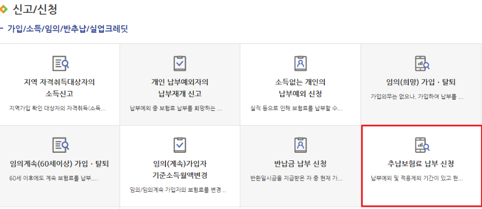국민연금 추납제도 신청은 국민연금 홈페이지에서 바로 할 수 있습니다. 국민연금공단 홈페이지 전자민원- 신고 신청을 선택하면 추납신청을 할 수 있습니다.