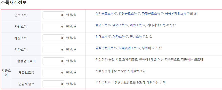 소득인정액을 계산하는 게 쉽지 않기 때문에 복지로 홈페이지에서 제공하는 소득인정액 계산기를 이용하면 누구나 자신의 소득인정액을 자동으로 계산할 수 있습니다.