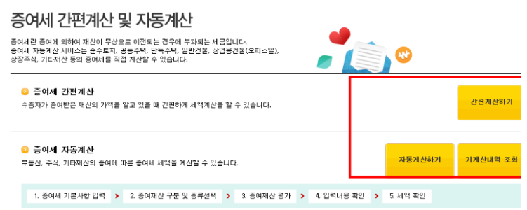 증여세 계산기는 국세청 홈택스에서 제공하고 있는데요. 부동산, 주식, 기타, 재산 등 증여하는 재산에 따라서 증여세를 계산해 볼 수 있습니다.
