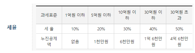 증여세율은 과세표준에 세율을 곱해서 계산하며 10~50% 총 5단계 과세표준 구간으로 나눠집니다.