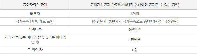배우자는 6억 원, 직계존속 5천만 원 (미성년자인 경우 2천만 원), 직계비속 5천만 원, 기타 친족은 1천만 원이 증여세 면제 한도액입니다.