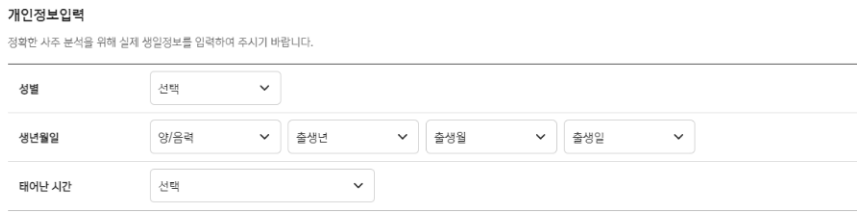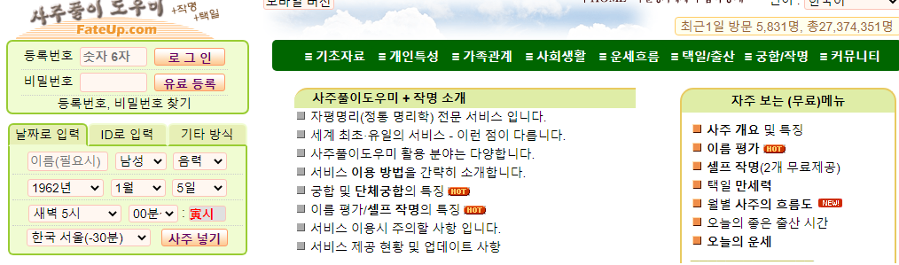 홈페이지 화면 왼쪽에 생일을 넣어 주면 바로 사주풀이가 가능합니다. 무료이기는 하지만 꽤 자세하게 나와 있는 편입니다. 유료적인 부분도 있지만 무료로 볼 수 있는 메뉴도 많기 때문에 심심할때 한 번씩 이용해 보시기 바랍니다.