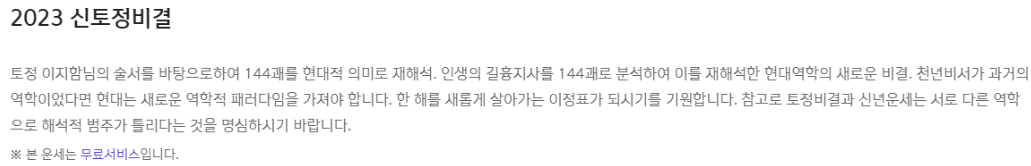 유료결제하고 보면 좀 더 자세하게 볼 수 있기는 하지만 무료 토정비결 역시 잘 되어 있기 때문에 재미 삼아서 가볍게 보고 싶은 분들을 위해서 토정비결 무료 2023 보는 곳을 알려드리겠습니다.