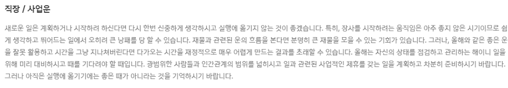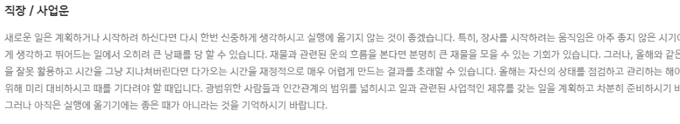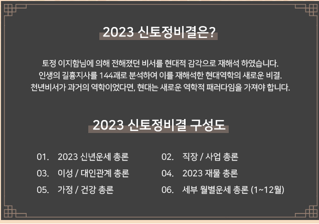 농협 토정비결 무료의 경우 신년운세 총론, 직장/사업 총론, 이성/대인관계 총론, 2023 재물 총론, 가정/ 건강 총론, 세부 월별운세 총론의 로 구성되어 있습니다.