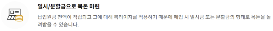 또한 납입원금은 전액이 적립되고 이에 대한 이자가 복 리로 적립되기 때문에 추후에 목돈으로 받아 노후준비에 사용할 수 있습니다.