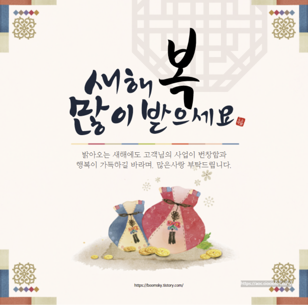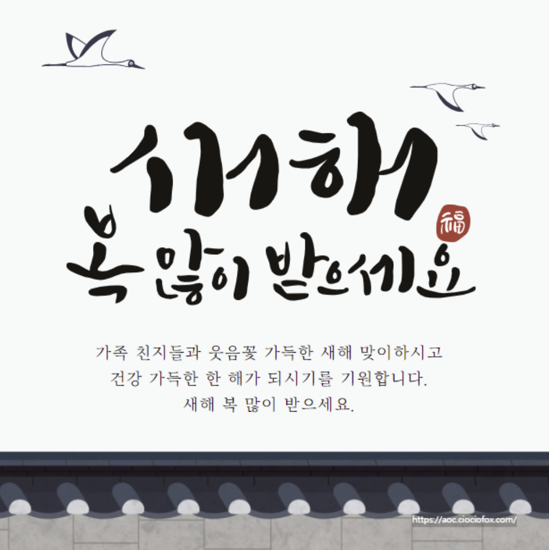 - 2023년 한 해 동안 고생 많으셨습니다. 2024년 새해에는 더욱더 행복하고 건강하시기를 바랍니다. 지난해 아낌없이 보내주셨던 사랑과 관심에 진심으로 감사합니다. 새해 복 많이 받으세요.