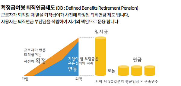 확정급여형 퇴직연금 DB형은 퇴직 후 받을 급여액이 미리 확정되는 방식으로 평균임금에 근속연수를 곱해 퇴직금을 산정하며 관련 기관에 운영을 맡기는 방식입니다.