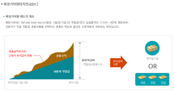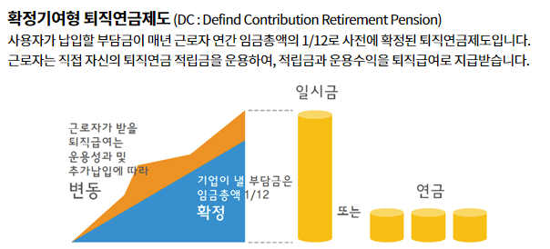 확정기여형 DC형 퇴직연금은 근로자가 매년 연봉을 12개월로 나눈 금액을 관련 기관에 맡기는 방식으로 운용수익에 따라 퇴직 후 급여액이 달라집니다.